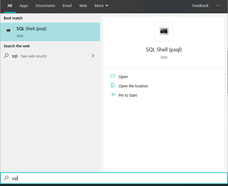 Masuk SQL Shell dengan mengetik SQL Shell pada Start Menu