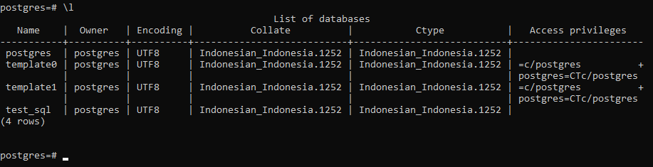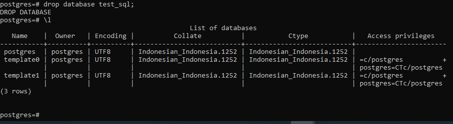 Kita bisa cek dengan mengetikan perintah \l, untuk memastikan Databasenya sudah terhapus