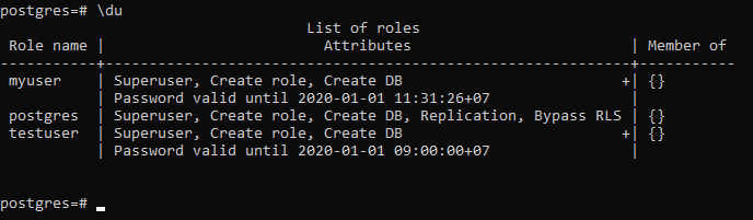 Untuk mengecek usernya bisa menggunakan perintah \du