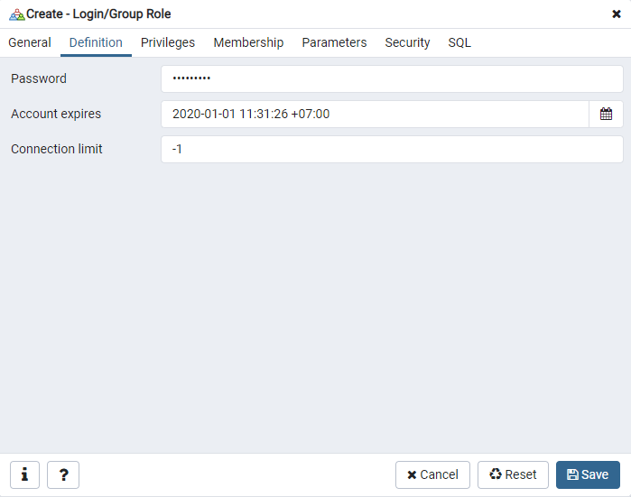 Pada tab Definition, masukkan Password dan tentukan Expired untuk User tersebut