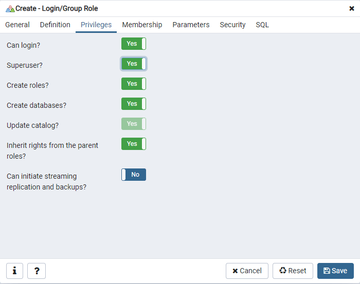 Pada tab Privileges, nyalakan Can Login dan Superuser menjadi YES, lalu klik tombol Save untuk membuat User