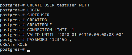 Saya akan membuat user testuser superuser yang valid sampai tanggal 1 Januari 2020 pukul 10:00:00 dengan password 123456