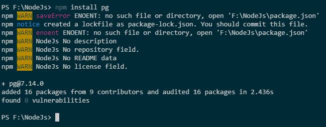 Ketikan “npm install pg” untuk menginstal Module postgreSQL NodeJs