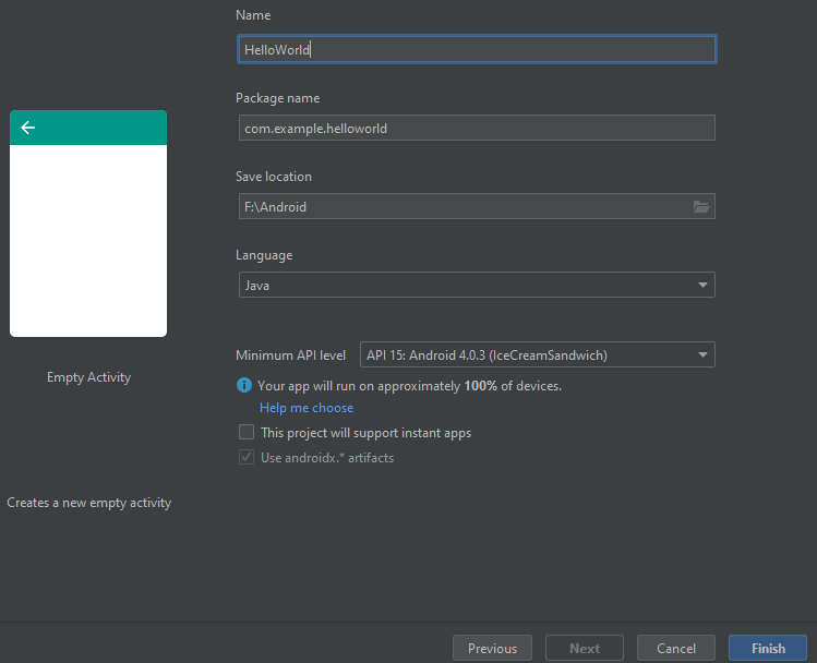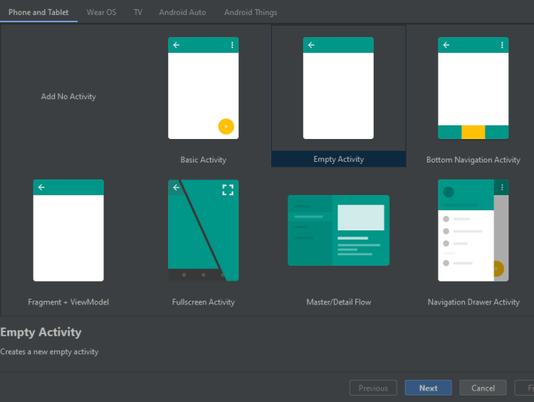 Pilih Empty Activity untuk membuat aktiviti kosong